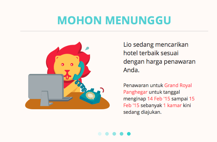Setelah menginput harga yang diinginkan (misalkan saya tadi menawar sebesar Rp799.000,- dari harga awal Rp921.000,-) dan memencet ‘Tawar Sekarang‘, maka berikutnya Lio akan mencarikan hotel terbaik sesuai dengan harga penawaran kamu.